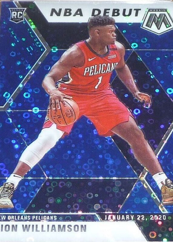 The Zion Williamson 2019 Mosaic #269 NBA Debut - Fast Break Blue /85 Rookie card in Raw condition has not changed in price in the last 30 days and was last sold for $26.40 .