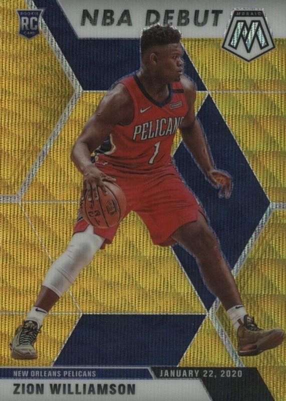 The Zion Williamson 2019 Mosaic #269 NBA Debut - Tmall Gold Wave Rookie card in Raw condition has not changed in price in the last 30 days and was last sold for $56.77 .