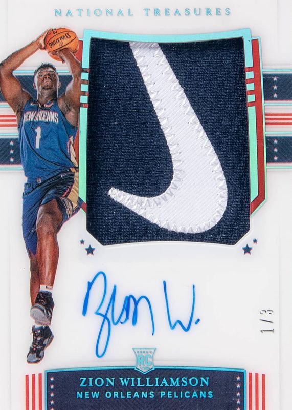 This card is 1 of 8 Zion Williamson's card variations in the 2019 National Treasures set being tracked by Sports Card Investor, including Rookie Patch Auto /99, Rookie Patch Auto - Stars & Stripes /30, Rookie Patch Auto - Gold /10, Rookie Patch Auto - Emerald /5, and Rookie Patch Auto - Logoman /1.