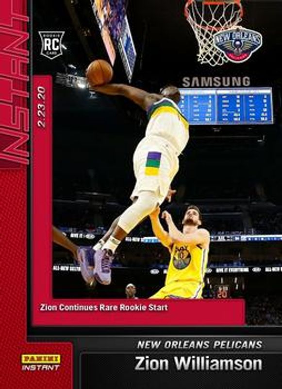 The Zion Williamson 2019 Panini Instant #101 Base Rookie card is 1 of 64 Zion Williamson's card variations in the 2019 Panini Instant set being tracked by Sports Card Investor, including #79 Base, #76 Base, #104 Base, #107 Base, and #128 Base.