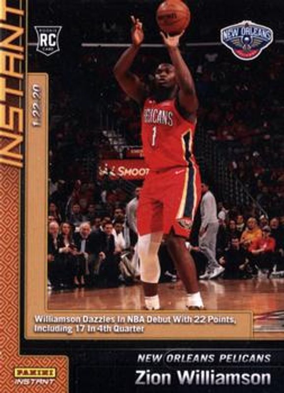The Zion Williamson 2019 Panini Instant #76 Yellow /88 Rookie card is 1 of 64 Zion Williamson's card variations in the 2019 Panini Instant set being tracked by Sports Card Investor, including #79 Base, #76 Base, #104 Base, #107 Base, and #128 Base.