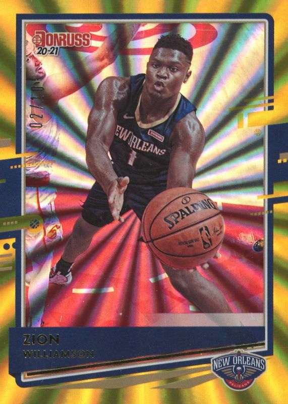 This card is 1 of 14 Zion Williamson's card variations in the 2020 Donruss set being tracked by Sports Card Investor, including Press Proof Silver /349, Press Proof Purple /199, Choice Red /99, Purple Laser /99, and Red Laser /99.