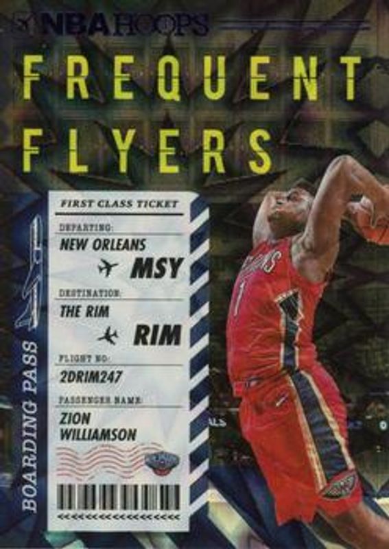 The Zion Williamson 2020 Hoops #4 Frequent Flyers - Purple Explosion card is 1 of 100 Zion Williamson's card variations in the 2020 Hoops set being tracked by Sports Card Investor, including #251 Base, #163 Base, #163 Blue, #163 Hyper Blue, and #163 Neon Green.