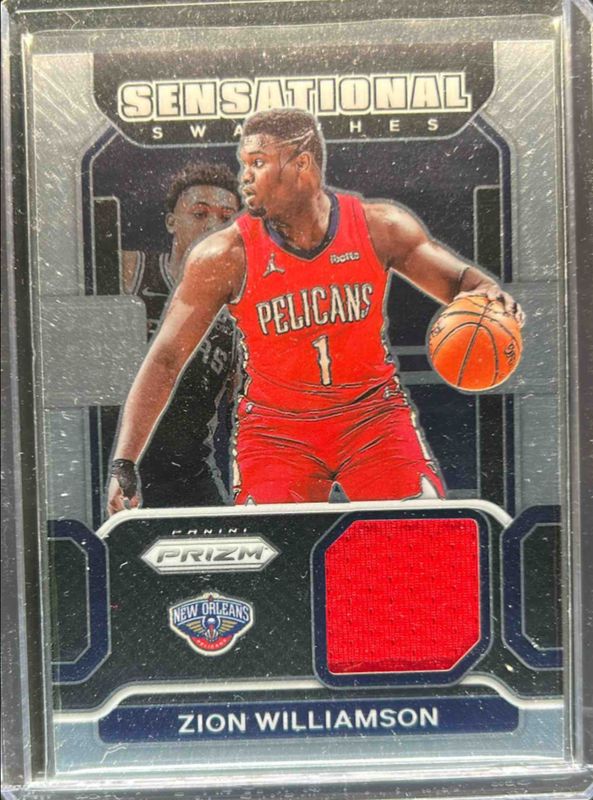 The Zion Williamson 2021 Prizm #SW-ZWL Sensational Swatches card is 1 of 115 Zion Williamson's card variations in the 2021 Prizm set being tracked by Sports Card Investor, including #108 Base, #108b Base, #108 Blue NBA 75th Anniversary, #108 Blue Wave, and #108 Choice Blue Yellow Green.