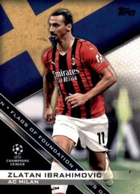 The Zlatan Ibrahimovic 2021 Topps UEFA Champions League #FF-14 Flags of Foundation card is 1 of 26 Zlatan Ibrahimovic's card variations in the 2021 Topps UEFA Champions League set being tracked by Sports Card Investor, including Base, Sparkle Foil, Starball Foil, Aqua Foil /299, and Yellow Foil /250.