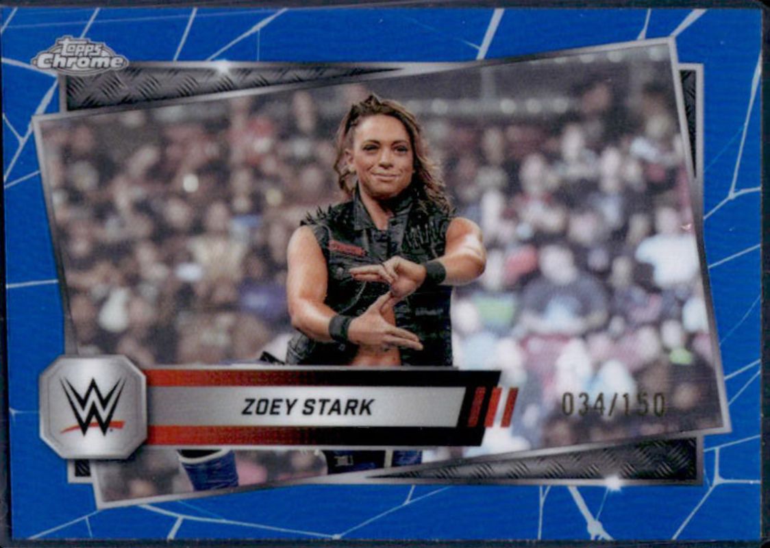 The Zoey Stark 2025 Topps Chrome WWE #174 Blue Refractor /150 card is 1 of 50 Zoey Stark's card variations in the 2025 Topps Chrome WWE set being tracked by Sports Card Investor, including Base, Black & Gold Refractor, Geometric Refractor, Neon Green & Black Refractor, and Pink Shimmer Refractor.