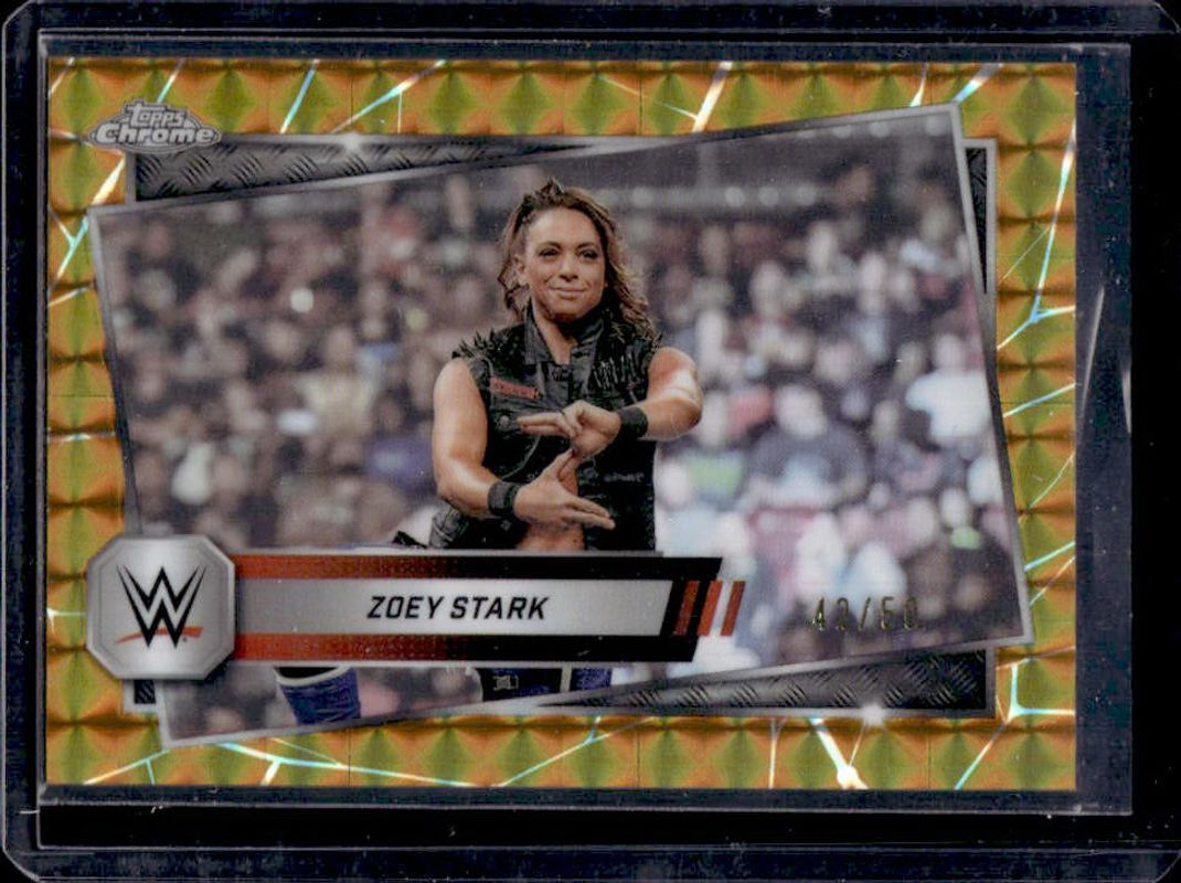 The Zoey Stark 2025 Topps Chrome WWE #174 Gold Geometric Refractor /50 card is 1 of 50 Zoey Stark's card variations in the 2025 Topps Chrome WWE set being tracked by Sports Card Investor, including Base, Black & Gold Refractor, Geometric Refractor, Neon Green & Black Refractor, and Pink Shimmer Refractor.