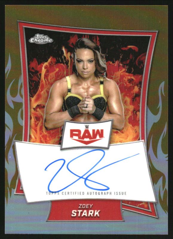 The Zoey Stark 2025 Topps Chrome WWE #RBA-ZOE Red Brand Autographs - Gold Refractor /50 card is 1 of 50 Zoey Stark's card variations in the 2025 Topps Chrome WWE set being tracked by Sports Card Investor, including Base, Black & Gold Refractor, Geometric Refractor, Neon Green & Black Refractor, and Pink Shimmer Refractor.