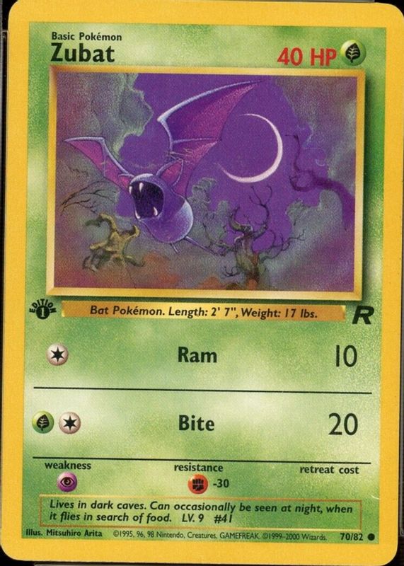 The Zubat 2000 Team Rocket #70/82 1st Edition card in Raw TCG (Near Mint) condition has moved up $0.14 (+3.5%) in the last 30 days and was last sold for $4.13 .