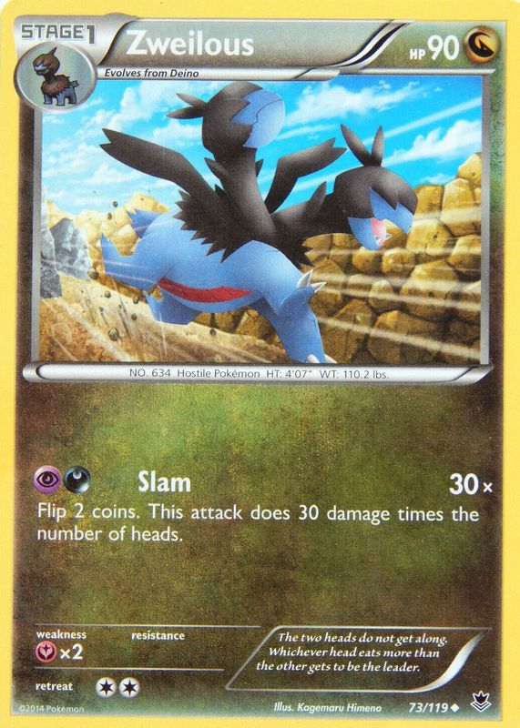 The Zweilous 2014 XY: Phantom Forces #073/119 Base card in Raw TCG (Near Mint) condition has not changed in price in the last 30 days and was last sold for $1.25 .