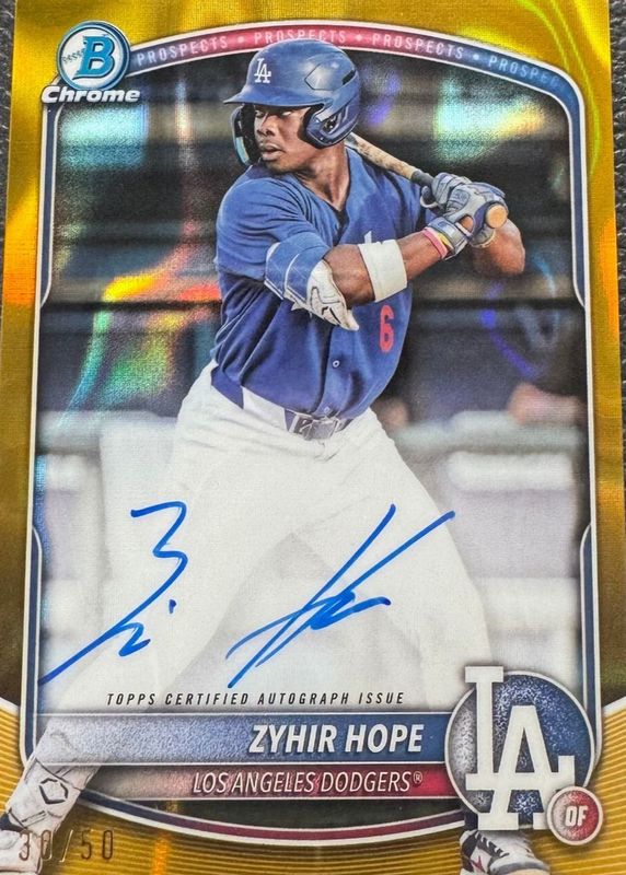 The Zyhir Hope 2025 Bowman #CPA-ZH Chrome Prospect Auto - Gold Lava Refractor /50 card in Raw condition has not changed in price in the last 30 days and was last sold for $229.50 .