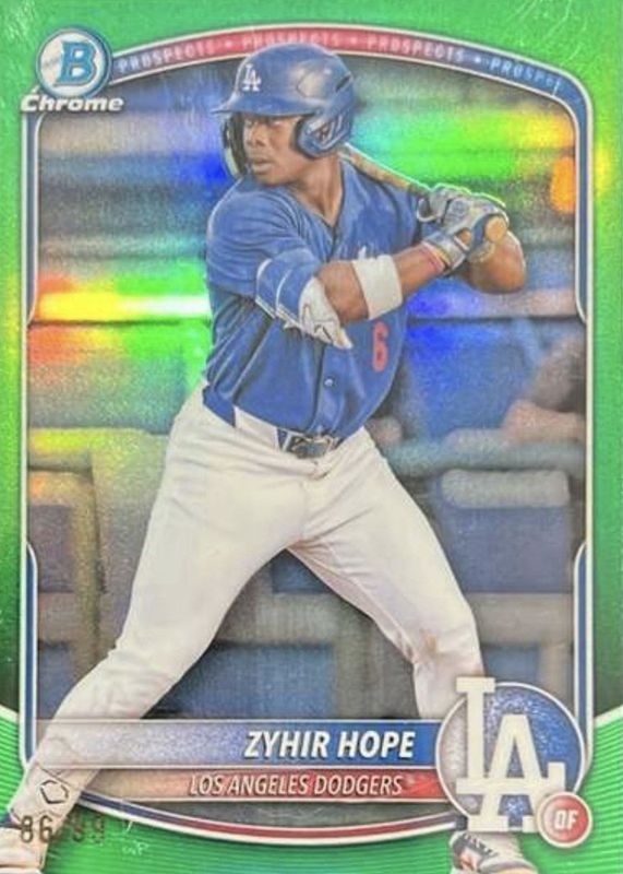 The Zyhir Hope 2025 Bowman #BCP-2 Chrome Prospects - Green Refractor /99 card in Raw condition has not changed in price in the last 30 days and was last sold for $3.25 .