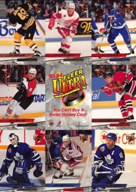 The top trending card in 1993 Fleer Ultra is currently Alexei Kovalev / Doug Gilmour / Felix Potvin / Jeremy Roenick / Joe Juneau / Mark Recchi / Mats Sundin / Sergei Fedorov 1993 Fleer Ultra Promo Sheet.