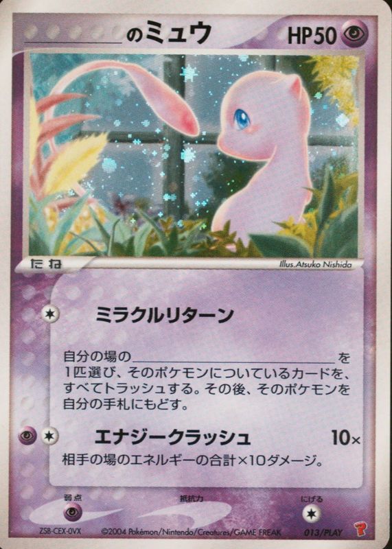 We track 10 players in 2004 Japanese PLAY Promo cards set including ____'s Mew, ____'s Celebi, Moltres ex, ____'s Jirachi, Articuno ex, Boost Energy, Cyclone Energy, Warp Energy, Zapdos ex, and Master Ball.