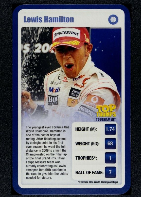 We track 1 players in 2009 Top Trumps Tournament Sporting Heroes cards set including Lewis Hamilton.