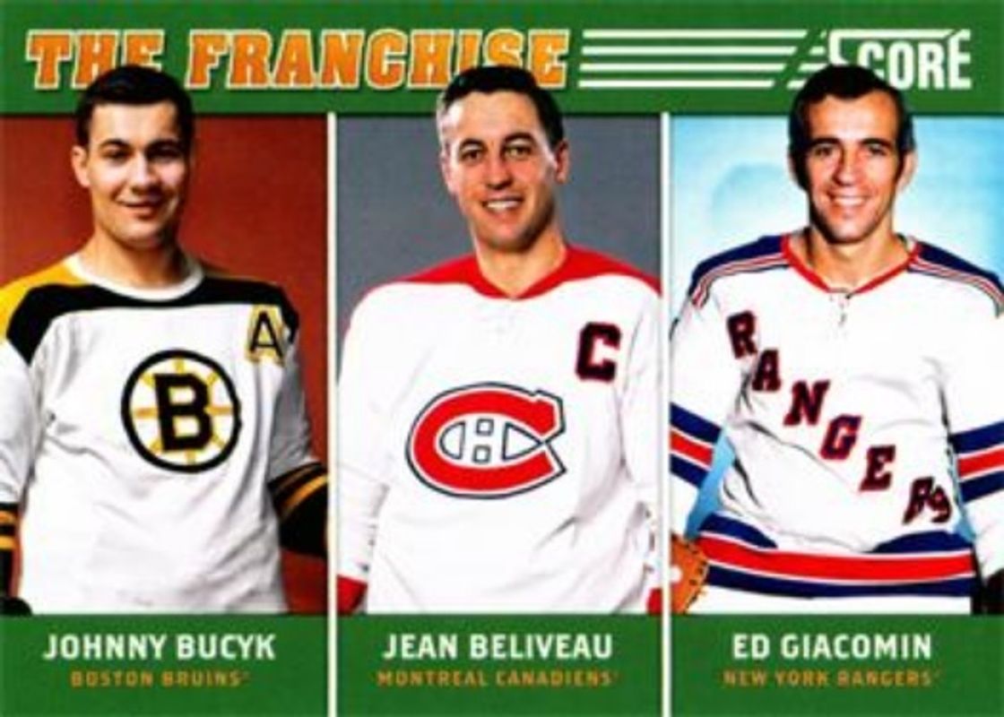 The top trending card in 2012 Score is currently Ed Giacomin / Jean Beliveau / Johnny Bucyk 2012 Score #FCL2 The Franchise Original Six.