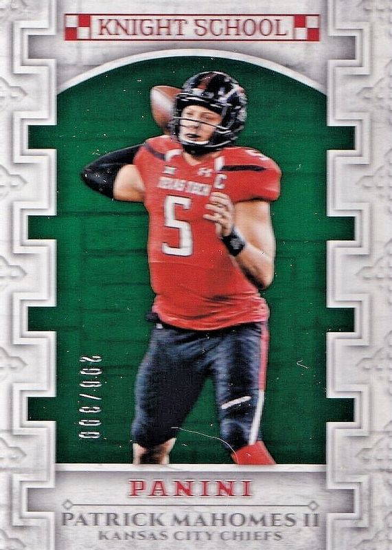 The top trending card in 2017 Panini is currently Patrick Mahomes II 2017 Panini #KNS-PM Knight School - Green /399.