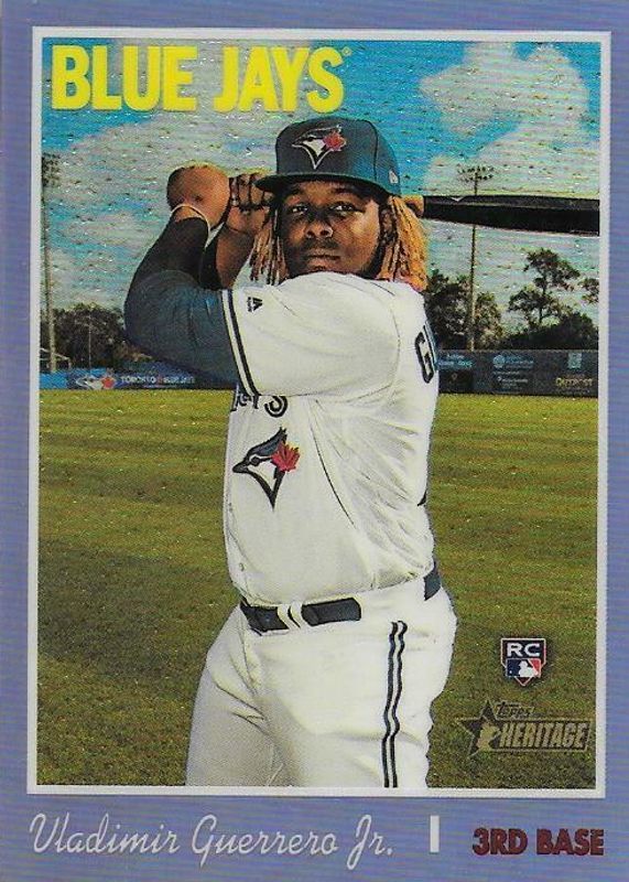 The top trending card in 2019 Topps Heritage is currently Vladimir Guerrero Jr. 2019 Topps Heritage #THC-504 Purple Hot Box Refractor.