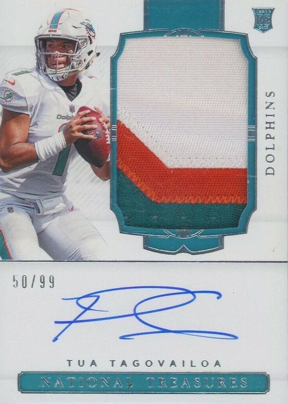 The top trending card in 2020 National Treasures is currently Tua Tagovailoa 2020 National Treasures #157 Rookie Patch Auto /99.