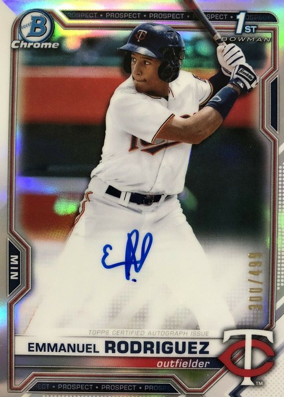 The top trending card in 2021 Bowman Chrome is currently Emmanuel Rodriguez 2021 Bowman Chrome #CPA-ERO Prospect Auto - Refractor /499 (1st).