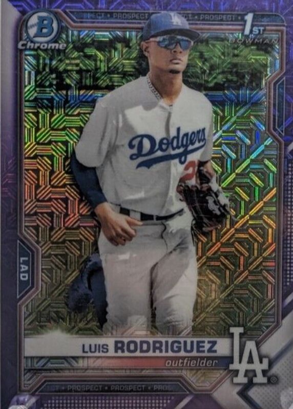 The top trending card in 2021 Bowman Chrome Mega Box is currently Luis Rodriguez 2021 Bowman Chrome Mega Box #BCP-196 Prospects - Purple Refractor /250 (1st).