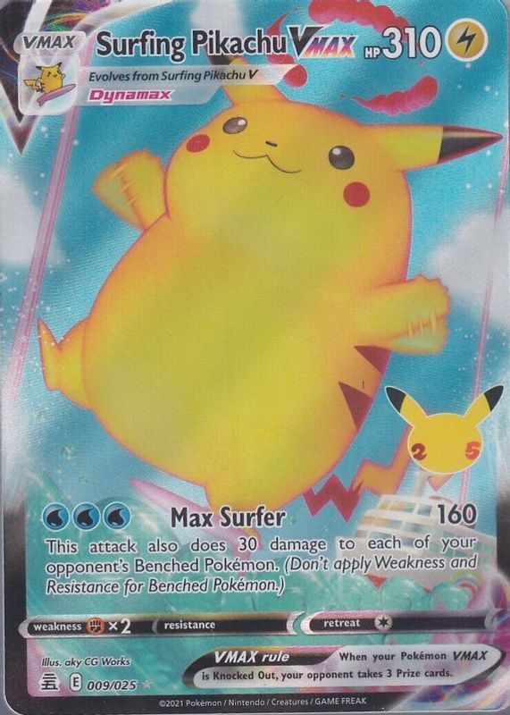 The top trending card in 2021 Celebrations is currently Surfing Pikachu VMAX 2021 Celebrations #009/025 Holo.