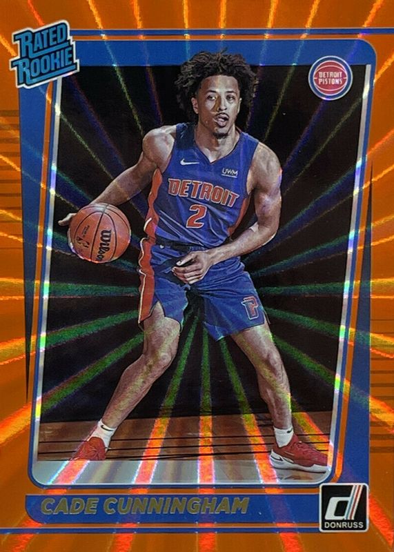 The top trending card in 2021 Donruss is currently Cade Cunningham 2021 Donruss #211 Orange Laser.