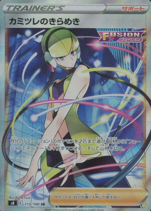 The top trending card in 2021 Japanese Sword & Shield: Fusion Arts is currently Elesa's Sparkle 2021 Japanese Sword & Shield: Fusion Arts #113/100 Super Rare.