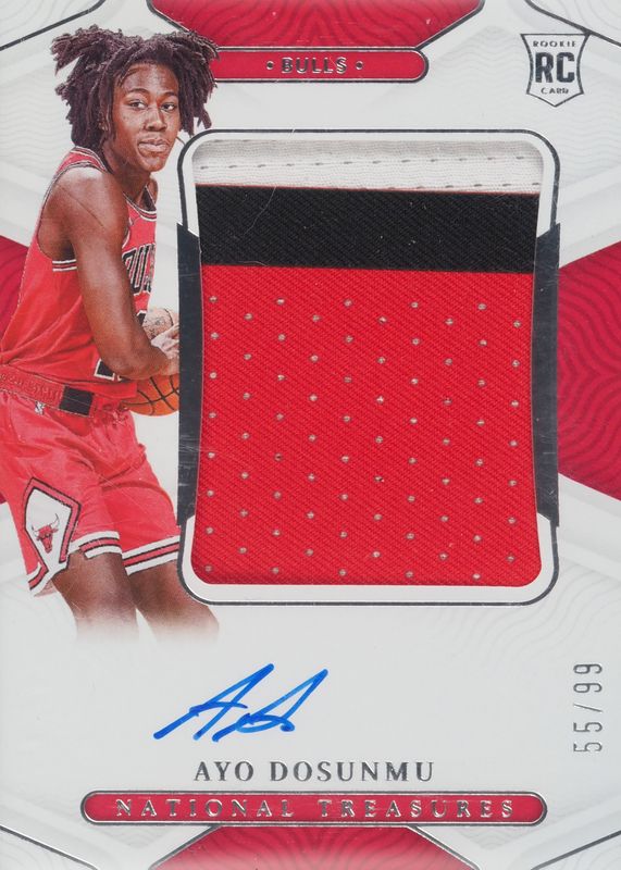 The top trending card in 2021 National Treasures is currently Ayo Dosunmu 2021 National Treasures #132 Rookie Patch Auto /99.