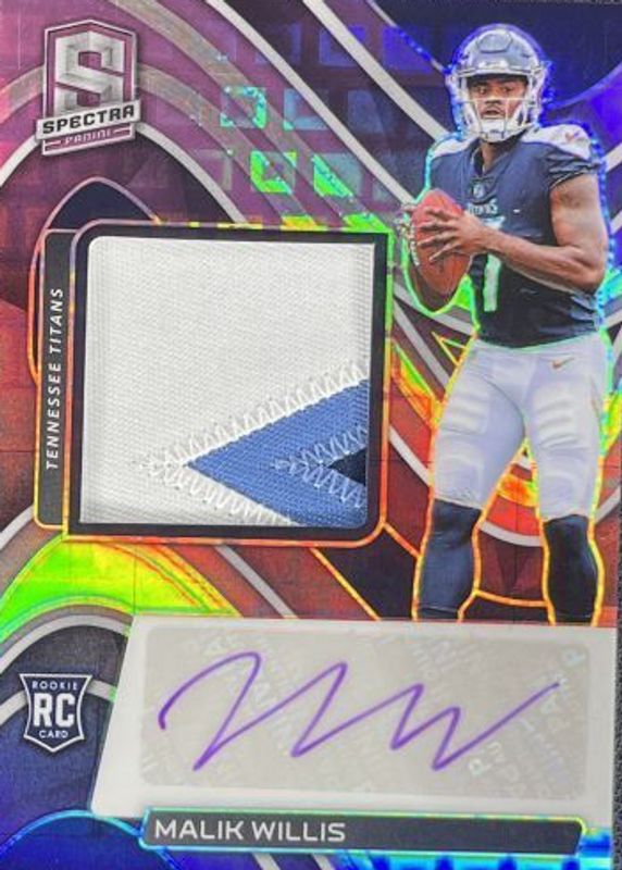 The top trending card in 2022 Spectra is currently Malik Willis 2022 Spectra #225 Rookie Patch Auto - Neon Purple /30.