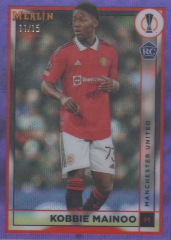 The top trending card in 2022 Topps Merlin Chrome UEFA Club Competitions is currently Kobbie Mainoo 2022 Topps Merlin Chrome UEFA Club Competitions #97 Purple Wave Refractor /15.