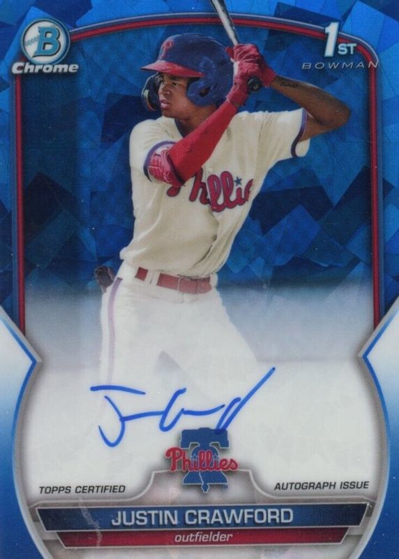The top trending card in 2023 Bowman Sapphire Edition is currently Justin Crawford 2023 Bowman Sapphire Edition #BSPA-JC Chrome Prospect Auto (1st).