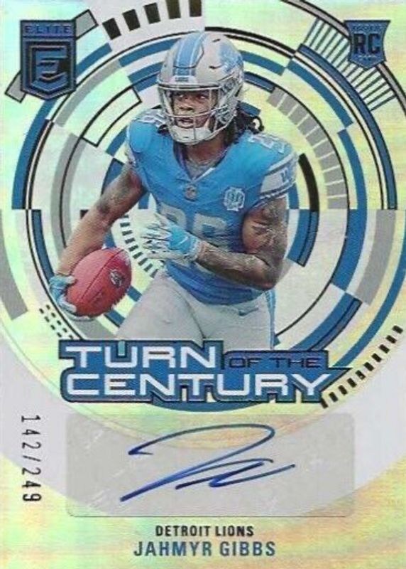 The top trending card in 2023 Elite is currently Jahmyr Gibbs 2023 Elite #TC-JAH Turn of the Century Autographs /249.