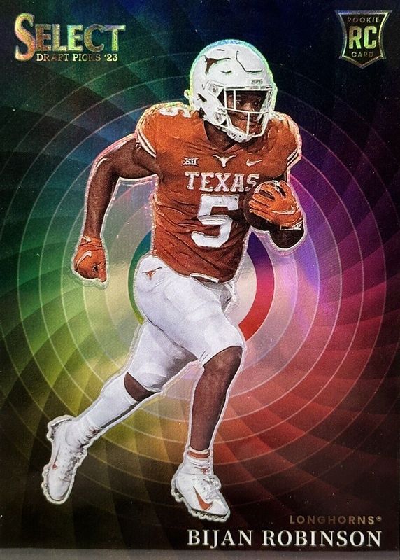 The top trending card in 2023 Select Draft Picks is currently Bijan Robinson 2023 Select Draft Picks #CW-BR Color Wheel /(SSP).