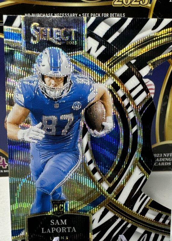 The top trending card in 2023 Select is currently Sam LaPorta 2023 Select #106 Premier Level Zebra Die-Cut /(SSP).