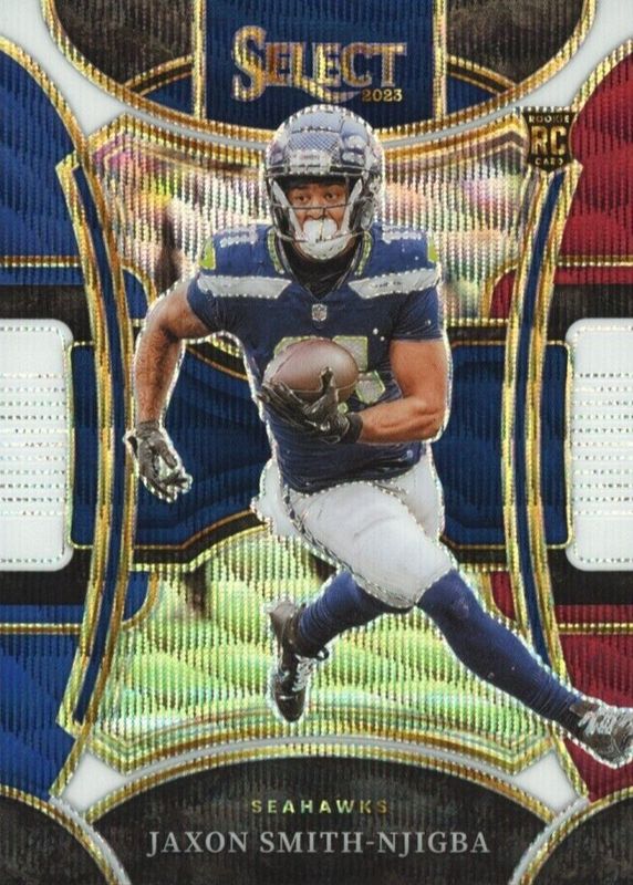 The top trending card in 2023 Select is currently Jaxon Smith-Njigba 2023 Select #485 Suite Level Tri-Color /149.