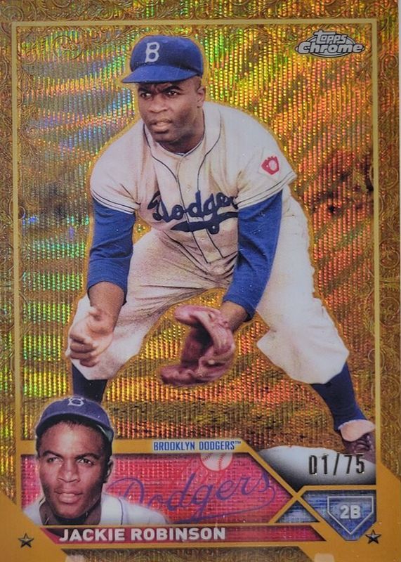 The top trending card in 2023 Topps Gilded Collection is currently Jackie Robinson 2023 Topps Gilded Collection #60 Wave Gold Etch Refractor /75.