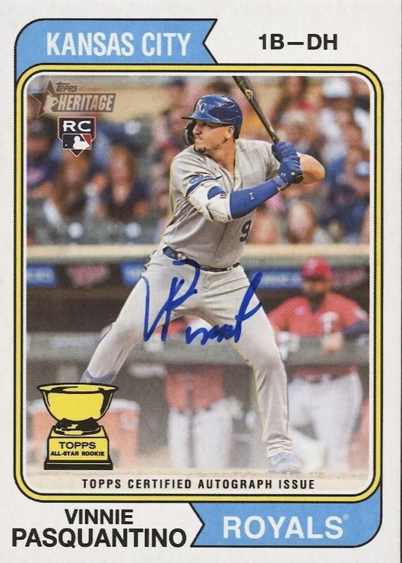 The top trending card in 2023 Topps Heritage is currently Vinnie Pasquantino 2023 Topps Heritage #ROA-VP Real One Autographs.