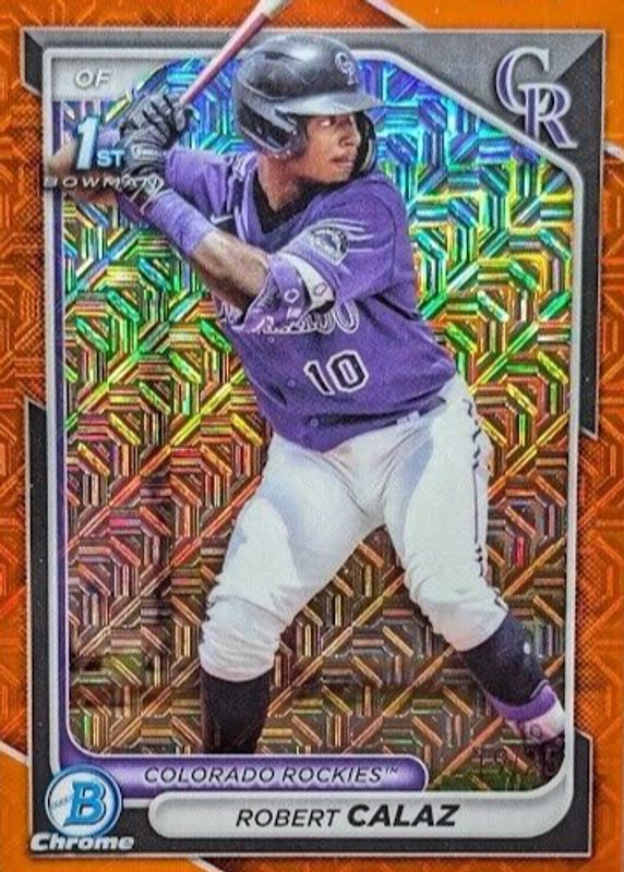 The top trending card in 2024 Bowman Mega Box is currently Robert Calaz 2024 Bowman Mega Box #BCP-131 Chrome Prospects - Orange Refractor /25 (1st).