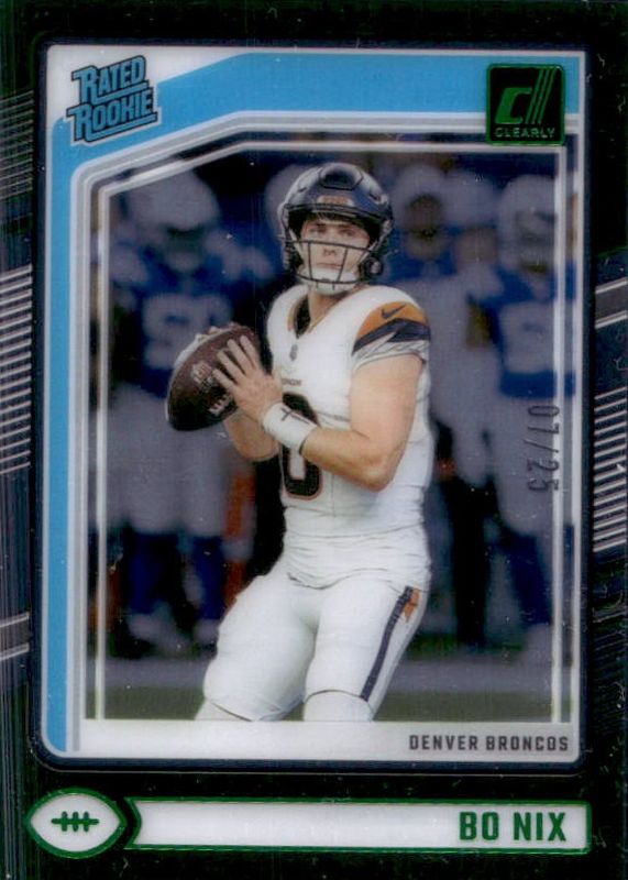 The top trending card in 2024 Clearly Donruss is currently Bo Nix 2024 Clearly Donruss #56 Green /25.