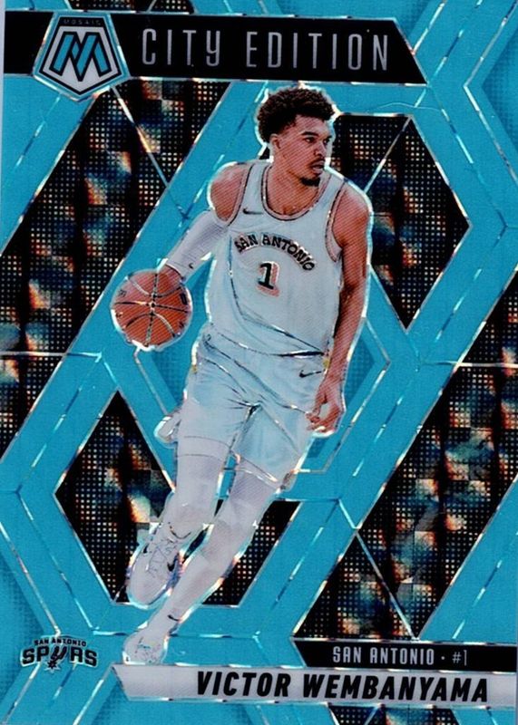 The top trending card in 2024 Mosaic is currently Victor Wembanyama 2024 Mosaic #288 City Edition - Blue Fluorescent /75.