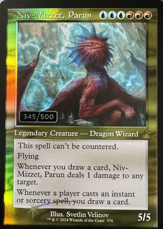 The top trending card in 2024 Ravnica Remastered is currently Niv-Mizzet, Parun 2024 Ravnica Remastered #376 Retro Frame /500.