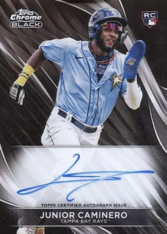 The top trending card in 2024 Topps Chrome Black is currently Junior Caminero 2024 Topps Chrome Black #CBA-JCA Autographs.