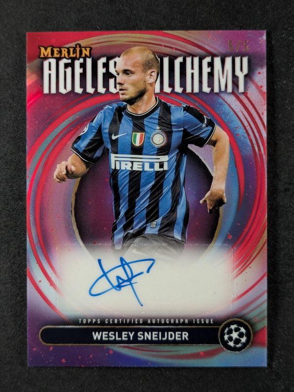 The top trending card in 2024 Topps Merlin Chrome UEFA Club Competitions is currently Wesley Sneijder 2024 Topps Merlin Chrome UEFA Club Competitions #AAA-WS Ageless Alchemy Autographs - Red Refractor /5.
