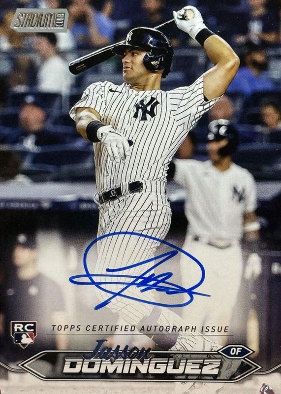 The top trending card in 2024 Topps Stadium Club is currently Jasson Dominguez 2024 Topps Stadium Club #SCBA-JDO Autographs.