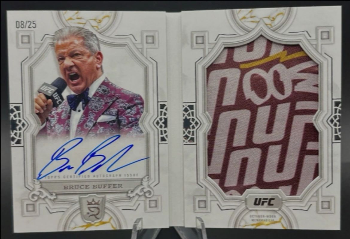The top trending card in 2024 Topps UFC Royalty is currently Bruce Buffer 2024 Topps UFC Royalty #JRB-BBR Autographed Jumbo Relic Booklet /25.