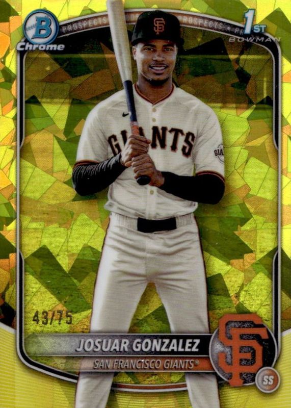 The top trending card in 2025 Bowman Chrome Sapphire Edition is currently Josuar Gonzalez 2025 Bowman Chrome Sapphire Edition #BCP-153 Prospects - Yellow /75 (1st).