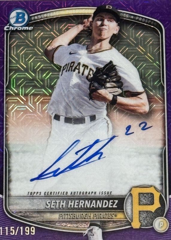 The top trending card in 2025 Bowman Draft Mega Box is currently Seth Hernandez 2025 Bowman Draft Mega Box #BMA-SH Prospect Auto - Purple Mega Refractor /199.