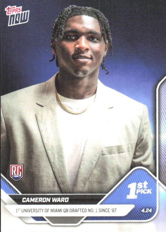 The top trending card in 2025 Topps Now Draft is currently Cam Ward 2025 Topps Now Draft #D-1 Base (Print Run: 30,006).