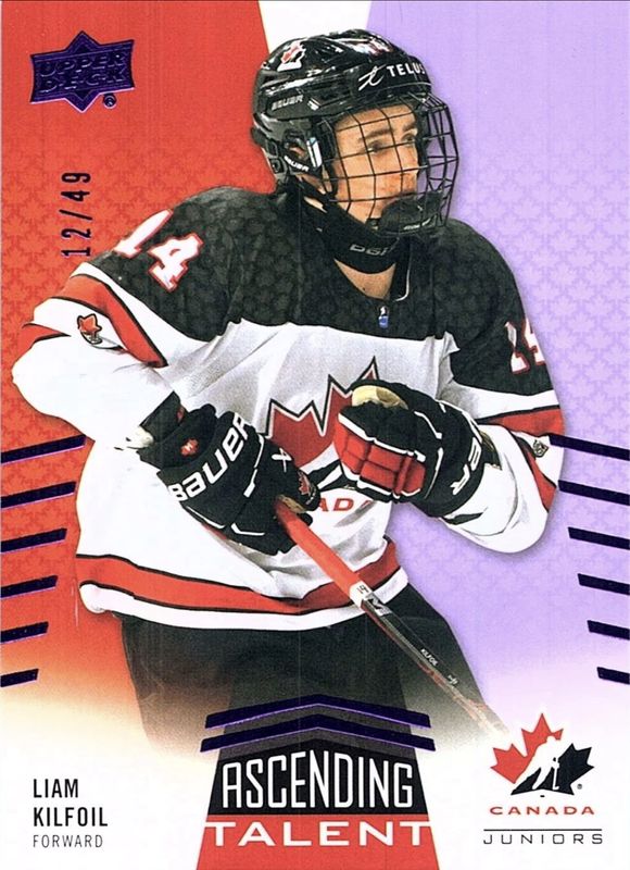 The top trending card in 2025 Upper Deck Team Canada Juniors is currently Liam Kilfoil 2025 Upper Deck Team Canada Juniors #AT-13 Ascending Talent - Purple /49.